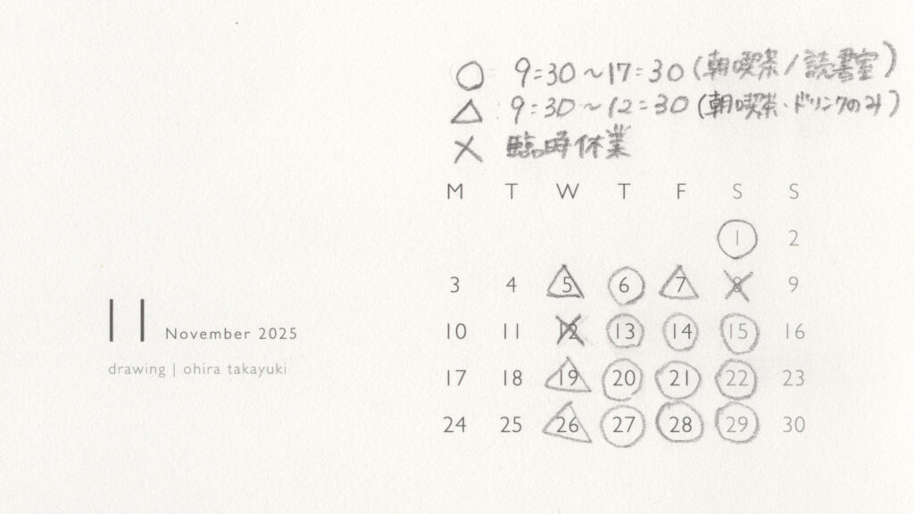 来月の営業予定投稿に先立って、【ご予約限定日】のお知らせです。12月6日及び31日は、都合によりご来店のタイミングを予測したく、読書室をご予約限定日とさせていた…